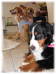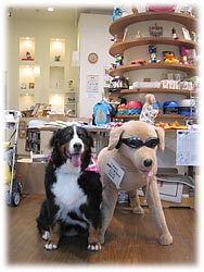 | ** ばーにーのレポート ** (2005.07.13) 1. わんこにお水のサービスがあります。 2. ヴィソラ内はわんこシールで入店可・不可の案内がされています。 3.お散歩は川の土手や広場があります。 |